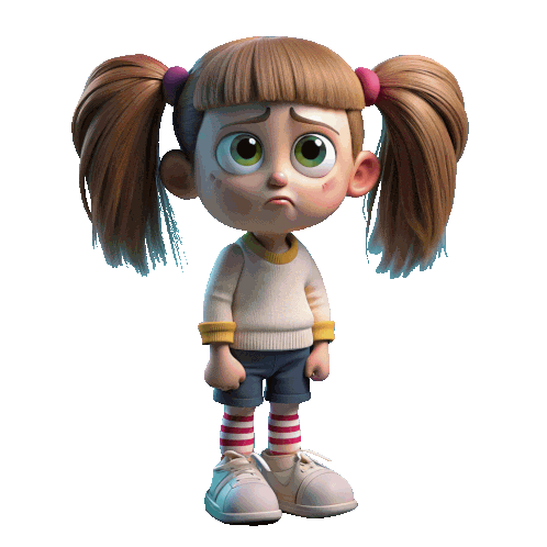 a cartoon girl with pigtails and striped socks is looking sad