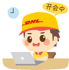 An animated DHL character is busy typing on a laptop, indicating they are currently in a meeting.