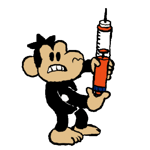 Cartoon monkey looking stressed while holding a large syringe, representing the challenges of Diabetes T1d and insulin injections.