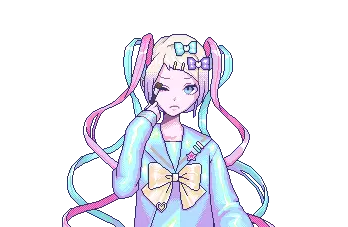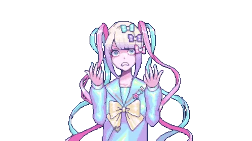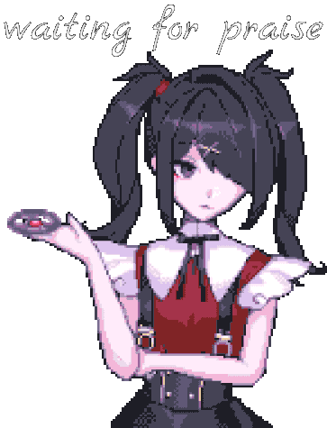 a pixel art drawing of a girl holding a cd and the words " waiting for praise "