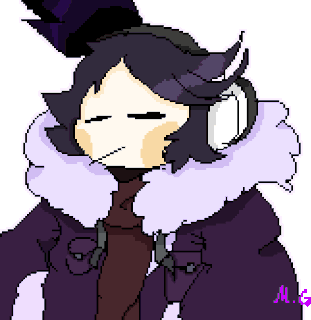 Drownie from Dialand, a pixel art character wearing headphones and a cozy purple coat with a fluffy collar.
