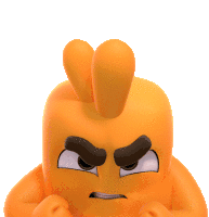An angry orange character from Dice Dreams with furrowed brows and crossed arms, showing frustration.