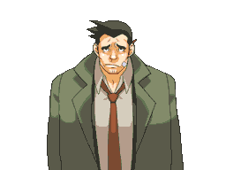 Dick Gumshoe from Ace Attorney in pixel art, looking sad and dejected with a bandage on his cheek.