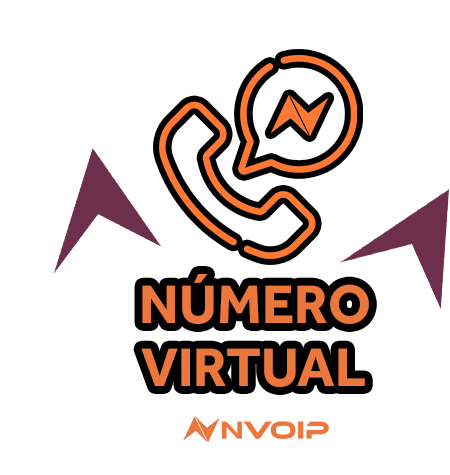 Animated sticker featuring a phone icon, speech bubble with lightning bolt, and text 'Número Virtual' for NVOIP services.