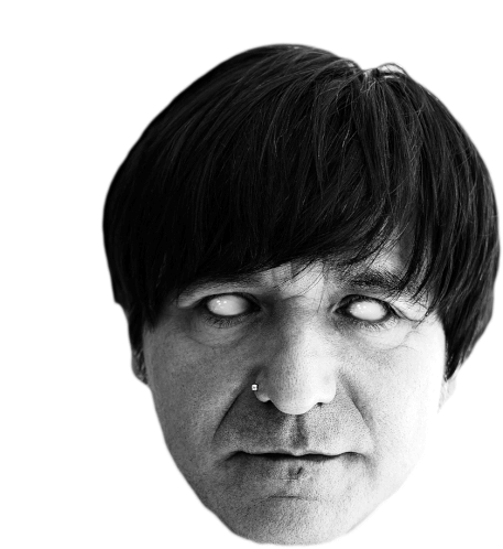 A black and white image of a Die Ärzte band member with intensely glowing yellow eyes, creating a striking and eerie look.