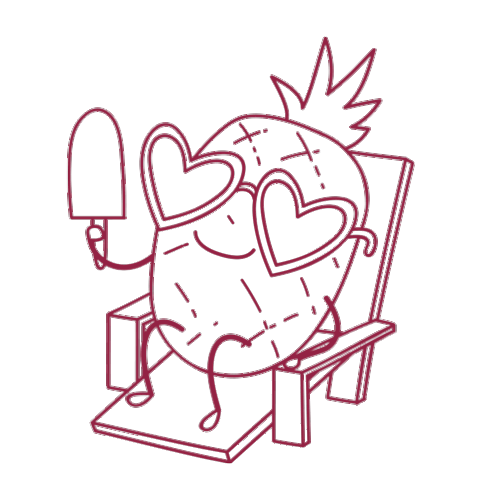 Dielo Diêlo pineapple character relaxing on a beach chair, wearing heart sunglasses and holding a popsicle.