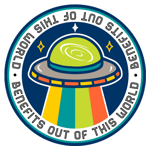 A circular sticker featuring a UFO emitting colorful beams, with the text 'Benefits Out of This World' and 'Different By Design'.