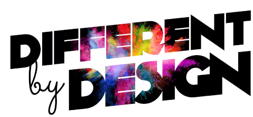 Animated logo featuring 'Different By Design' text, filled with vibrant, shimmering watercolor-like colors and textures.