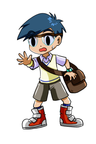 A surprised anime boy from Digimon Adventure with blue hair, glasses, and a messenger bag, looking startled.