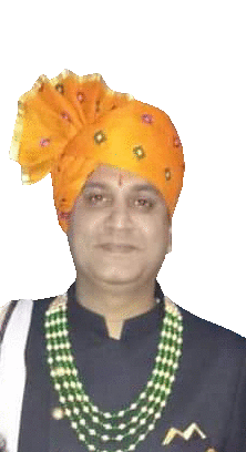 a man wearing an orange turban and green beads