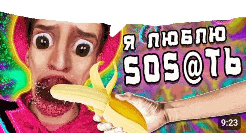 a cartoon of a man eating a banana with the time 9:23