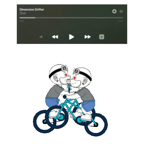 a cartoon of two robots riding a bike with the song dimension drifter playing in the background