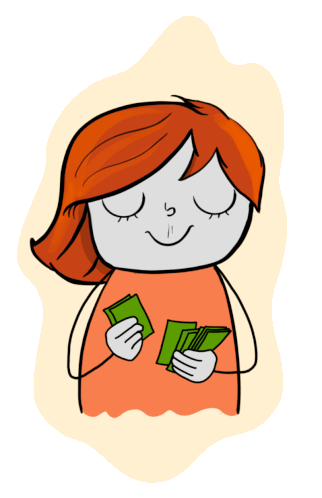 An animated sticker of a cartoon person with red hair, calmly counting green money bills with a content expression.