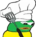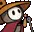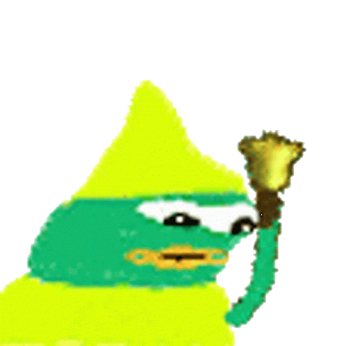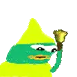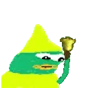A pixel art character, Dinkdonk, wearing a yellow hat and holding a bell, depicted in a simple, cartoonish style.