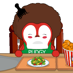 A Pudgy Penguin with an afro looks sad contemplating a healthy salad next to a bucket of fried chicken.