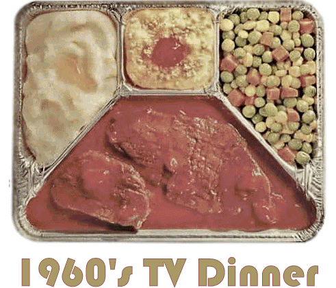 A visual comparison showcasing the evolution of TV dinners from a classic 1960s aluminum tray meal to a modern, plated frozen meal.
