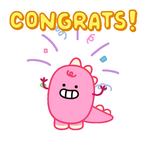 A cheerful pink dinosaur character wiggles and celebrates with confetti, displaying 'CONGRATS!' in a bubbly font.