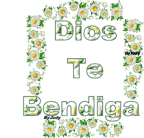 An animated sticker with 'Dios Te Bendiga' (God Bless You) and 'Que Religiosos Saludos' text, decorated with daisies and leaves.
