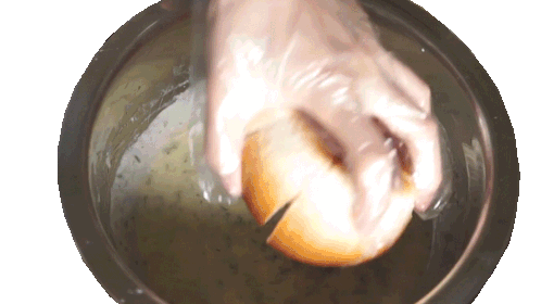 A gloved hand presses a large, round bread into a bowl of liquid, likely garlic butter, for Two Plaid Aprons.
