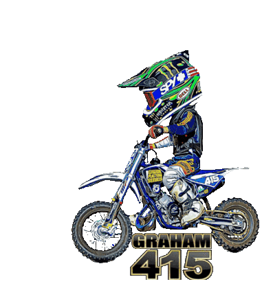 Graham, the motocross dirtbike rider, with his number 415, helmet sponsors, and plastering service logo.