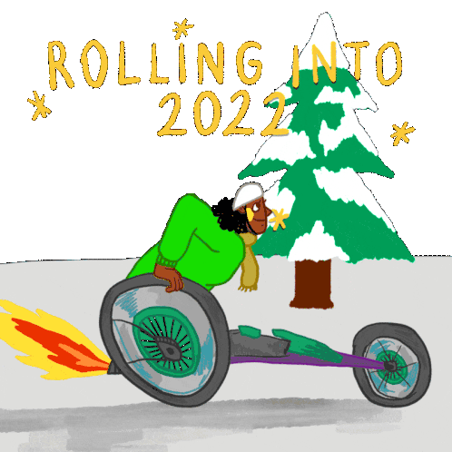 A person in a rocket-powered wheelchair rolls into 2022, celebrating the New Year with speed and determination.