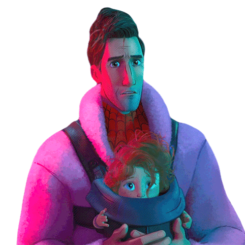 Peter B. Parker, wearing a robe, holds a sad Mayday Parker in a baby carrier, both looking disappointed.