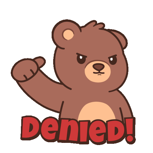 A cute but angry brown bear gives a thumbs down gesture with the word 'Denied!' appearing below, expressing disapproval.