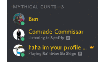 Discord usernames Ben, Comrade Commissar, Peter and the Wolf, Swiper, Damian Wayne, and Cheif with their statuses.
