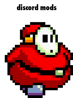 A pixel art depiction of an overweight Shy Guy character, labeled 'discord mods', humorously representing a Discord moderator.