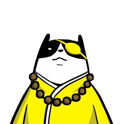 A cartoon cat character with a yellow eyepatch and robe, wearing a beaded necklace, appears to be pondering or observing.