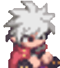 Disgaea character Mao, a pixel art boy with white hair, animatedly eats or consumes something.