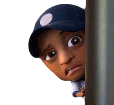 Deuce, the baseball player bobblehead character, peeks from behind a pillar with a disgusted expression, sticking out his tongue.