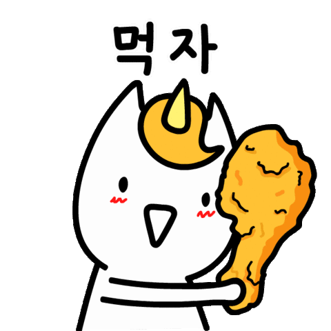 A cute animated cat character happily eating a large fried chicken leg with the Korean text '먹자' (Let's eat).