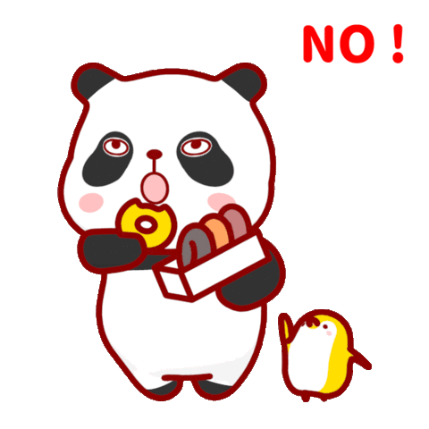A cute panda character looks annoyed, holding a donut and sushi, while a small yellow bird pokes its behind. The panda clearly expresses 'NO!'.