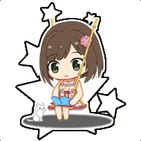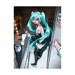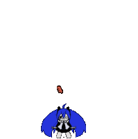 a cartoon drawing of a girl with blue hair and a brick with the number 999 on it