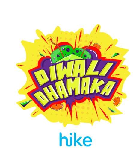 A vibrant animated 'Diwali Dhamaka' logo with firecrackers and the 'hike' brand, celebrating the festival of lights with 'शुभदीपावली'.