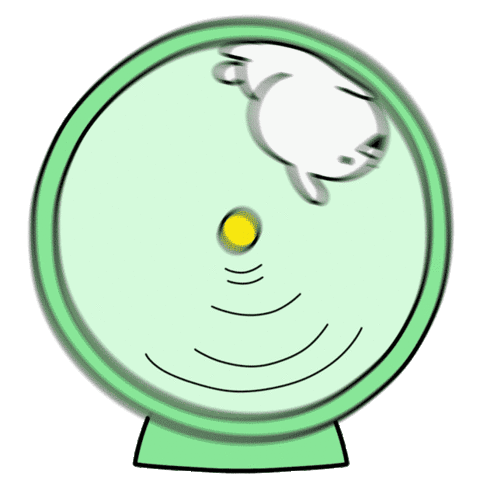 A cute white character spins rapidly inside a green hamster wheel, looking dizzy and feeling nauseous.