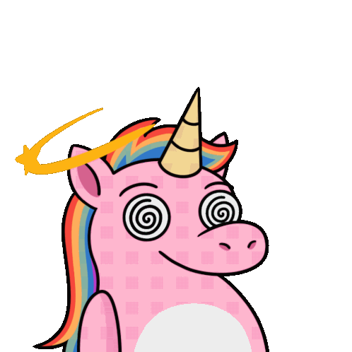 A pink unicorn with a rainbow mane and a yellow horn looks confused and dizzy, with swirling eyes and a rotating star.