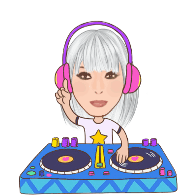 An animated DJ character with headphones and a turntable dances energetically, grooving to the music at a party.