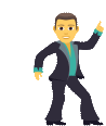Foekoe, a pixelated man in a suit, dances energetically, pointing his finger upwards in a cheerful emoji-style animation.