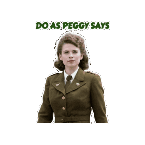 Peggy Carter, portrayed by Hayley Atwell, in her military uniform, with the commanding text 'Do as Peggy says.'