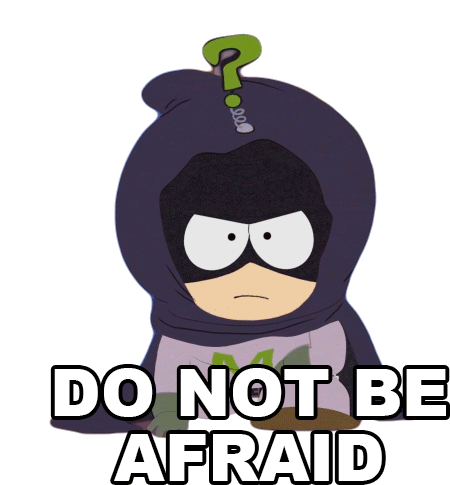 Mysterion, also known as Kenny McCormick, from South Park, reassures with the phrase 'Do Not Be Afraid'.