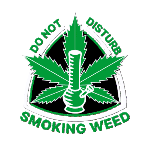 A vibrant green and yellow warning sticker featuring a marijuana leaf and a bong, with the text 'DO NOT DISTURB SMOKING WEED'.