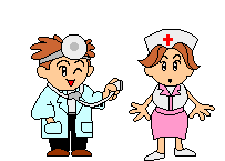 A pixel art doctor checks a nurse, who then comically pranks him with a giant syringe, leaving him terrified.