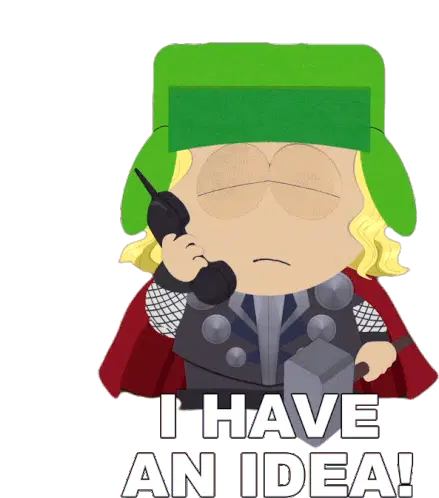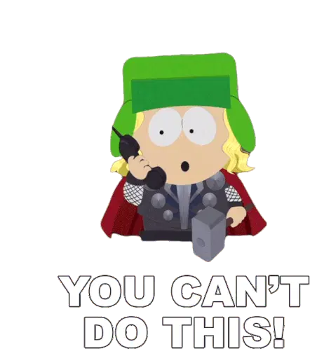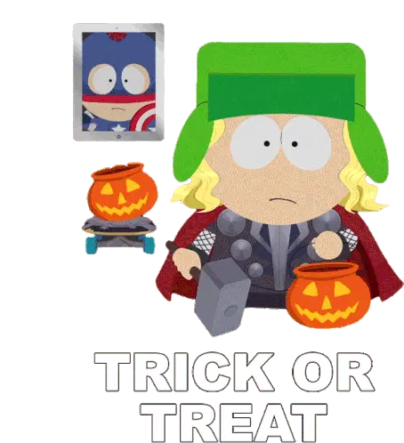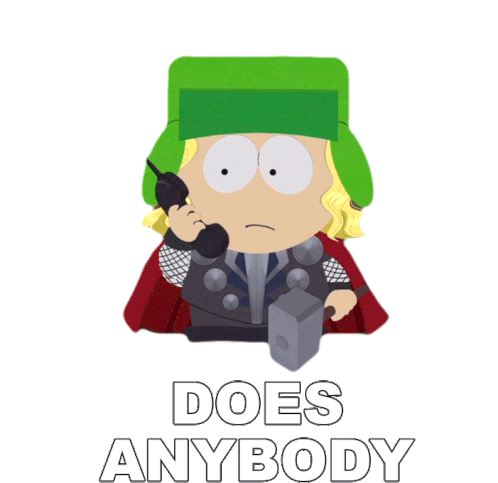 Kyle Broflovski, dressed as Thor, asks 'Does anybody Blockbuster anymore?' into a phone receiver.