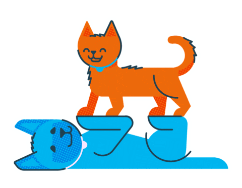 An orange cat stands playfully on the back of a blue cat lying down, showcasing a cute and acrobatic feline moment.