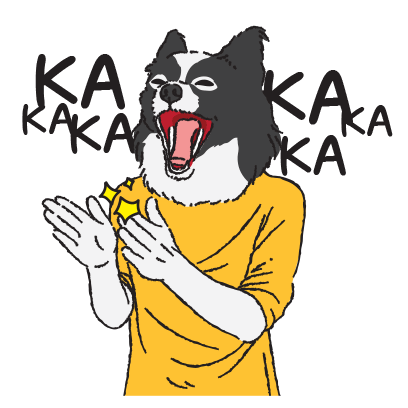 A cartoon dog with a human body laughs heartily while clapping its hands, with 'KA KAKA KA KA' text indicating laughter.