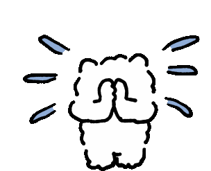 A cute cartoon Samoyed dog with a pleading expression, hands clasped in apology or request, surrounded by sweat drops.