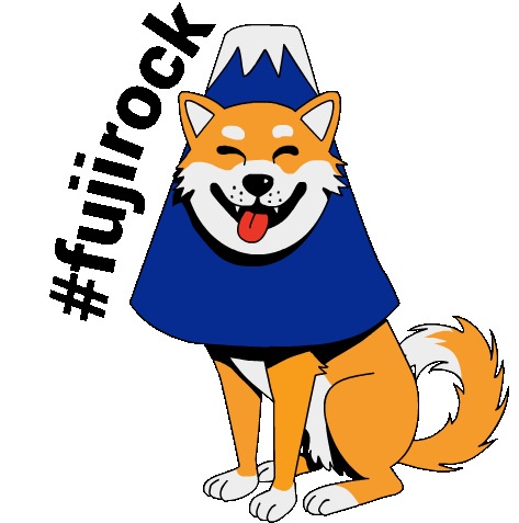 A cheerful Shiba Inu dog wears a fun Mount Fuji hat, celebrating the Fujirock festival with a happy smile.