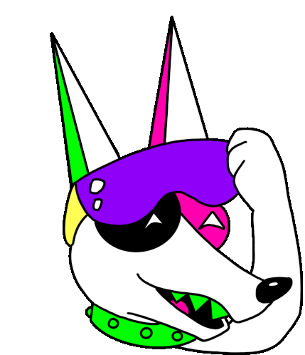 Rudedog, the cool neon punk dog, flexing with vibrant sunglasses and a spiked collar. A bold and energetic sticker.